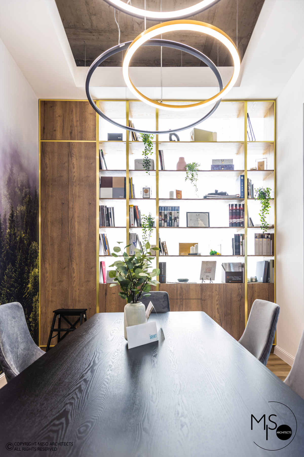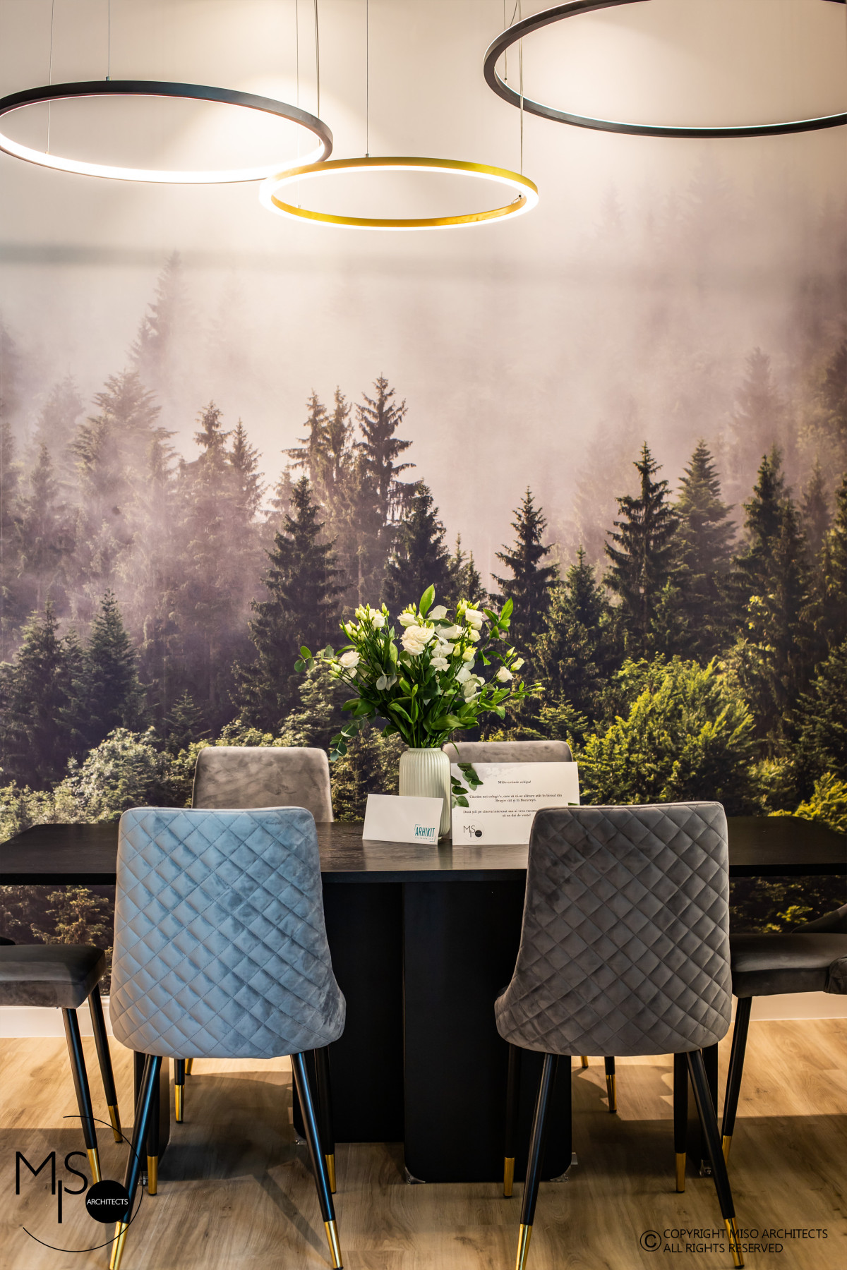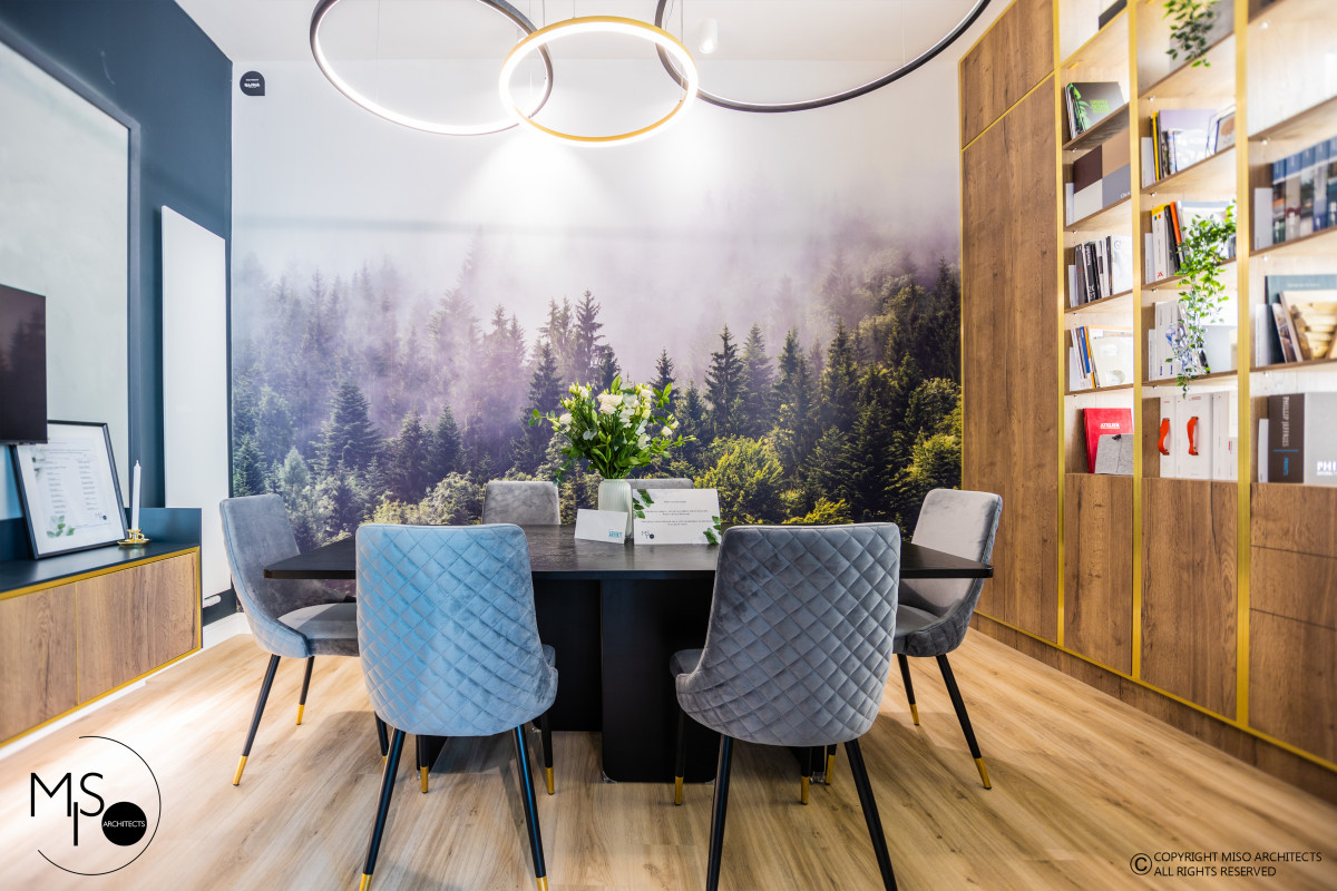 Elementul central care definește identitatea spațiului este tapetul Misty Fir Forest de la Rebel Walls, o alegere strategică ce ancorează biroul în contextul geografic al Brașovului. Imaginea brazilor învăluiți în ceață aduce liniștea pădurii direct în zona de lucru, mărind vizual spațiul și oferind o perspectivă de adâncime relaxantă. Acest fundal dramatic, dar natural, funcționează perfect în contrast cu mobilierul minimalist și detaliile tehnice, subliniind conceptul de biophilic design (design care integrează elemente naturale) pe care arhitecții îl promovează adesea în proiectele lor rezidențiale.