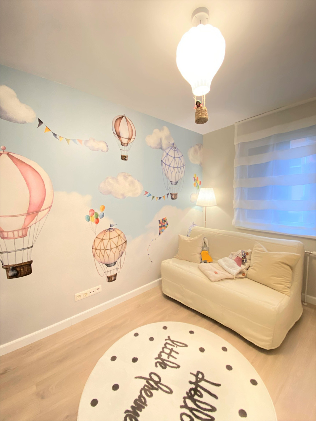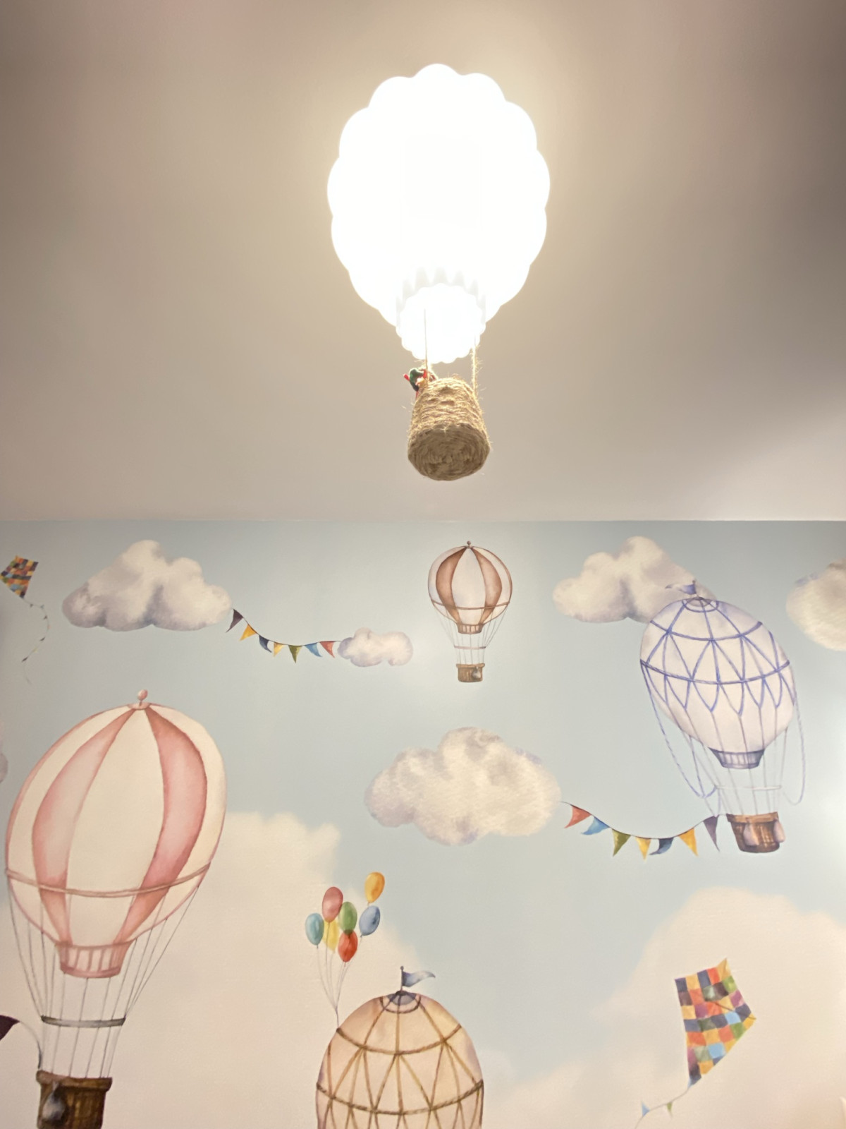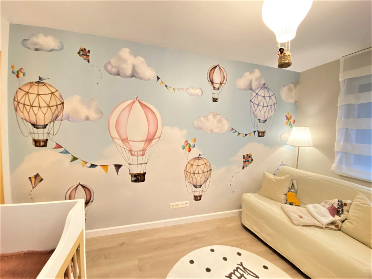 Tapet cu baloane cu aer cald, nori si steaguri, perfect pentru camera copilului. Tapet cu baloane cu aer cald, nori si steaguri, perfect pentru camera copilului.